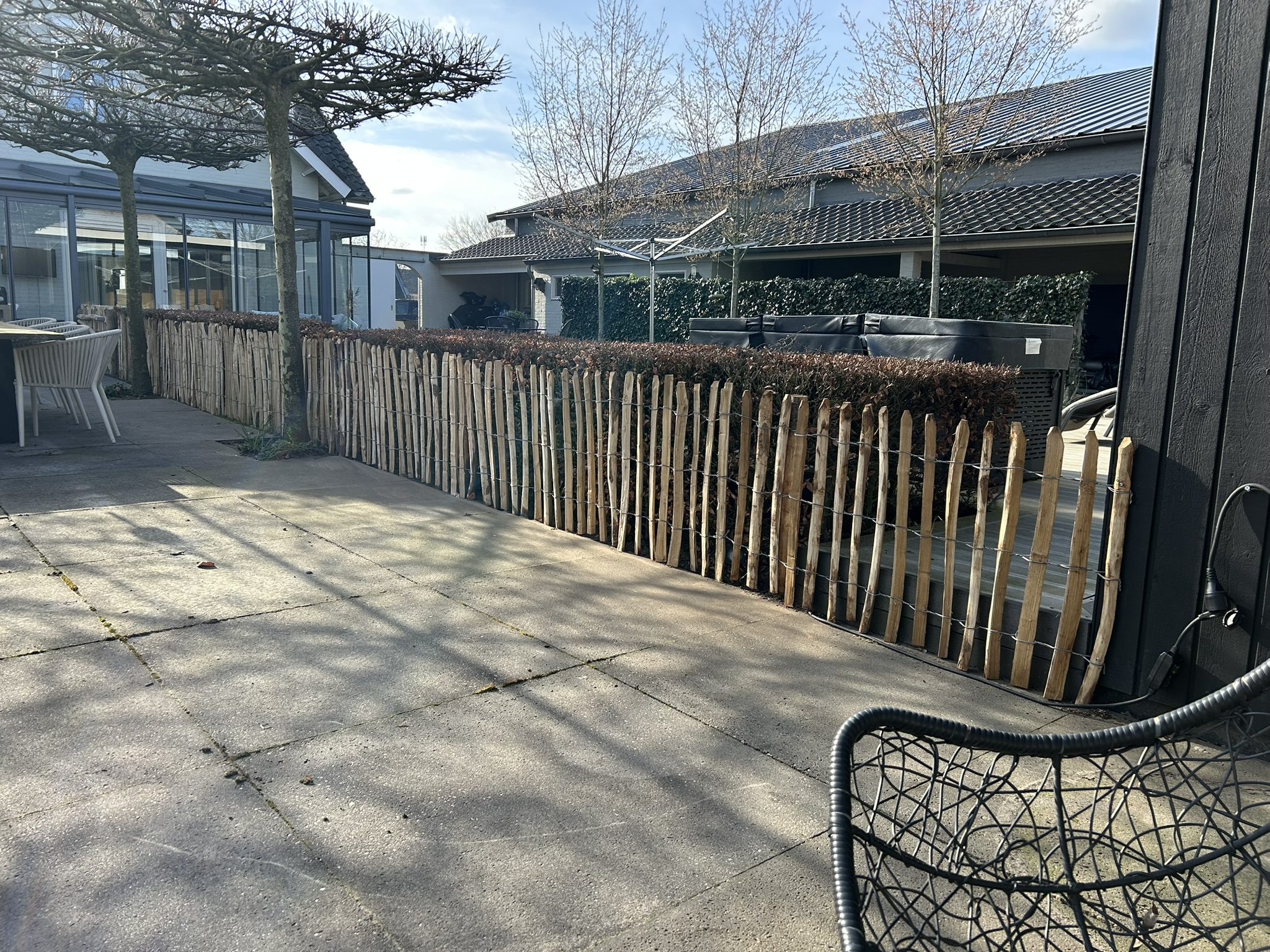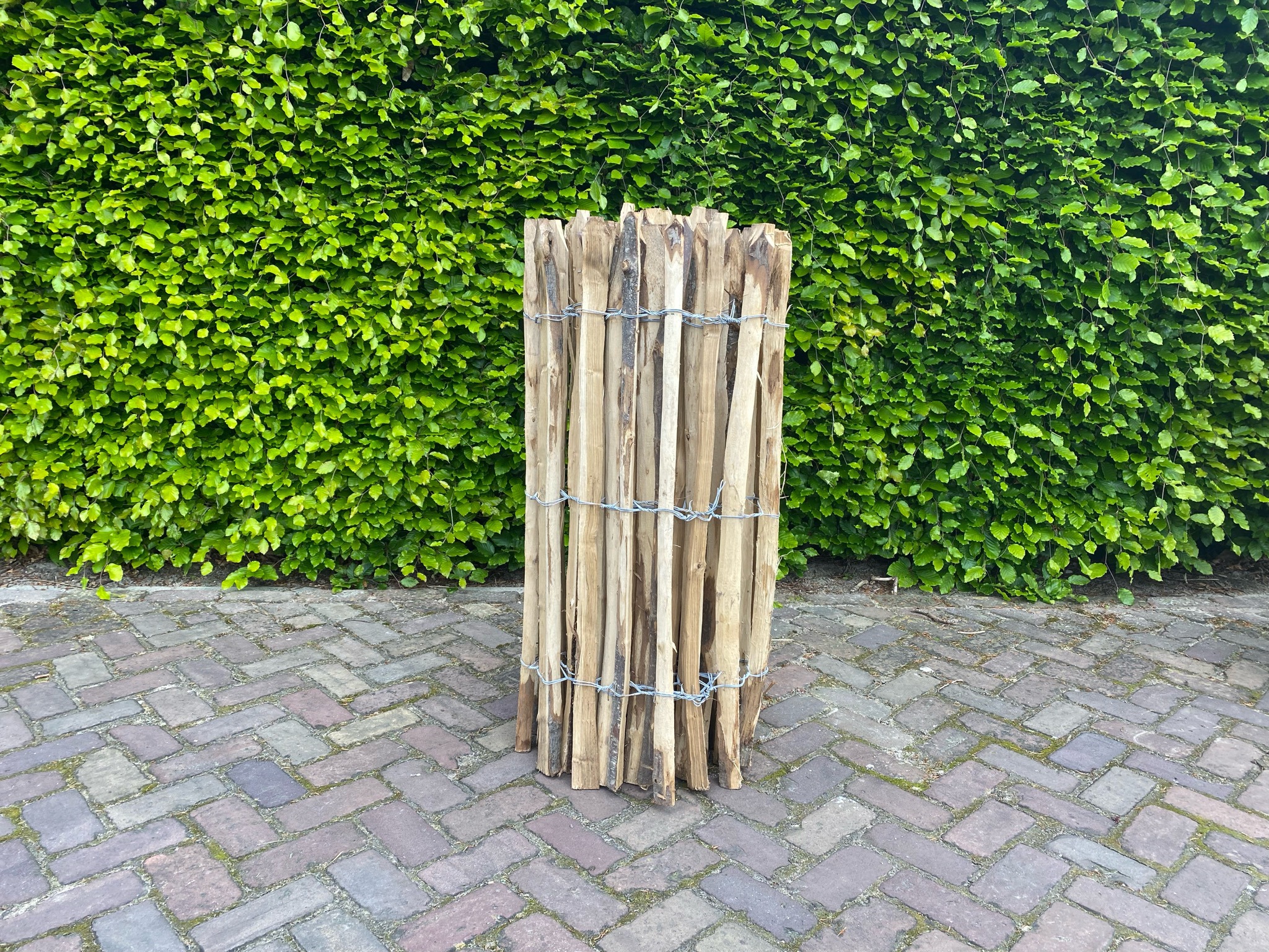Het kastanje hekwerk bestaat uit duurzaam gekloofde spijltjes die driedraads aan elkaar gevlochten zijn doormiddel van ijzerdraad. Het kastanje hekwerk is eerste kwaliteit origineel hekwerk. Deze hekwerken worden ook wel schapenhekken genoemd en zorgen voor een rustieke omheining/afrastering voor het afscheiden van tuinen, duinen, (dieren)weides etc. Het kastanjehout bevat een robuuste onregelmatige structuur wat zorgt voor een landelijke uitstraling in uw tuin of rondom het huis.
